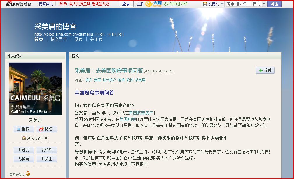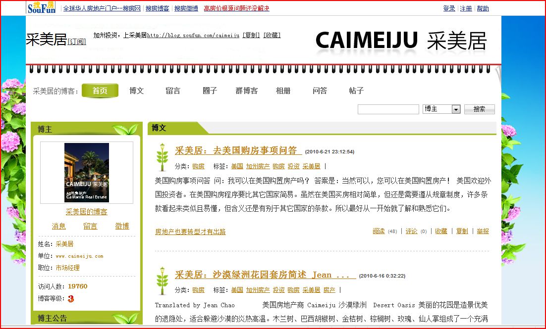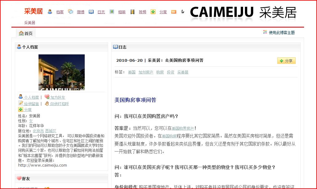 The Caimeiju Community provides Realtors and investors the opportunity to connect with each other and share personal stories, tips, and photos. Users can check out photos from other members, and read personal updates from Realtors around the country. Translation of Realtors blogs from English to Simplified Chinese is a premium member benefit.