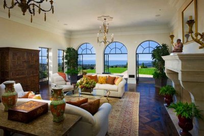打开前门,看到的是八角门厅,饰有饱满深色横梁和格子天花板,两侧分别为一间大型女用化妆室和客人衣帽间。紧接在前面是壮观的起居室,设有古色古香的石灰石壁炉边框,和漂亮的拼花图案地板。壮丽的景色向外延伸到覆盖的阳台和景观花园,形成一条轴。西方是整个蒙特西托山谷一望无际的景色,和沿着日落时分五彩缤纷的海岸线。