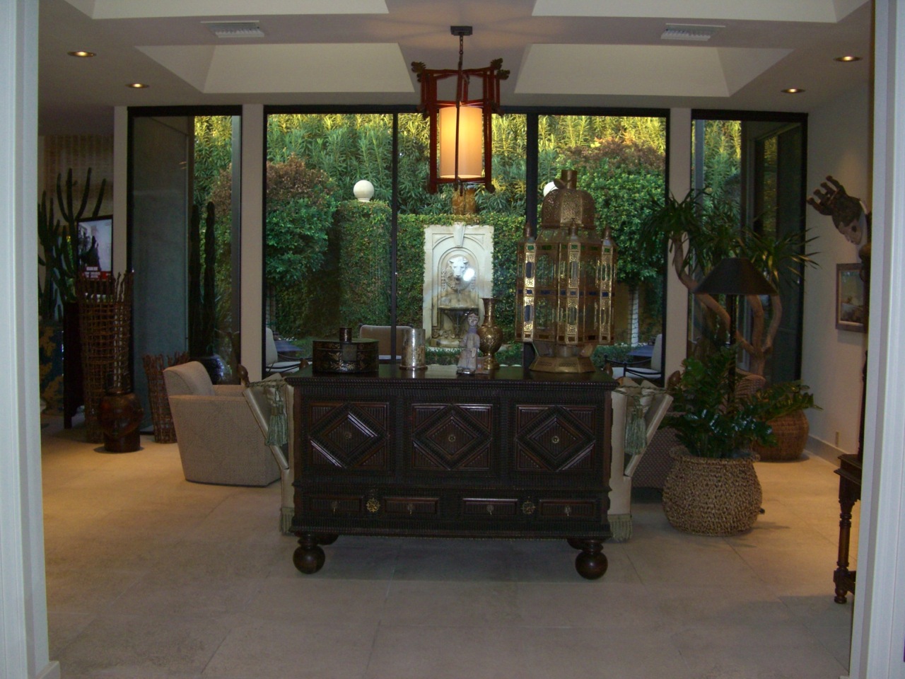 This chic Sitting Room is expansive as it opens into the garden and features dramatic skylights above with a Chinese deco lantern overhead.