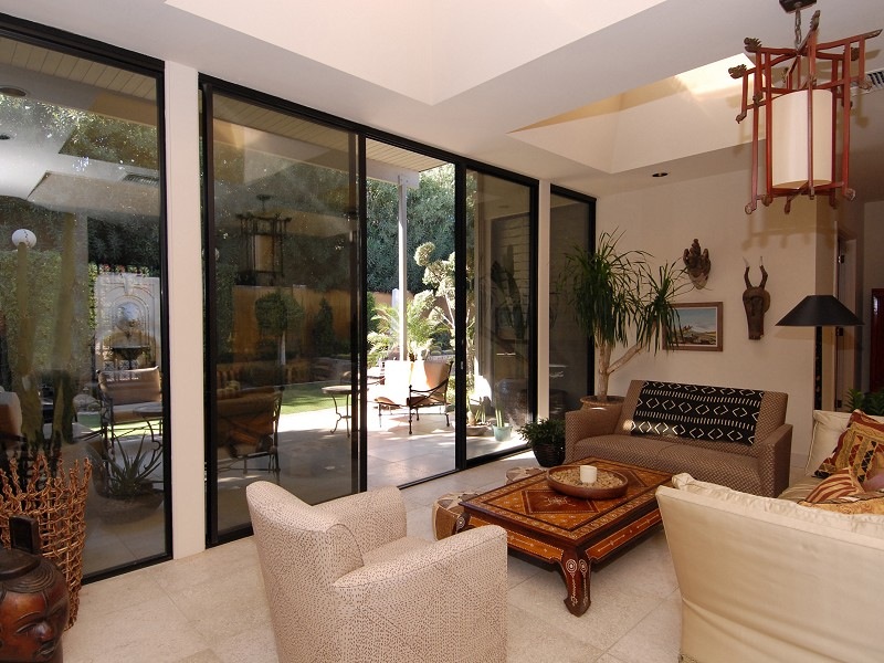 打开前门,就进入这个明亮的起居室,起居室装有四个天窗,通往庭院、喷泉和正式的绿洲花园。