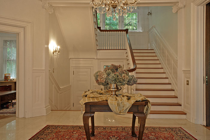 大型的后楼梯方便地连接全部四层楼,在底层泥区拥有独自的服务入口/出口,一扇上方装有磨砂玻璃的门隔开底楼外套和多用途大厅。诸多楼梯平台区有窗户、天窗 、存储和多用途衣柜 ,三楼大厅将一间女佣套房与其馀三楼区分隔开来。