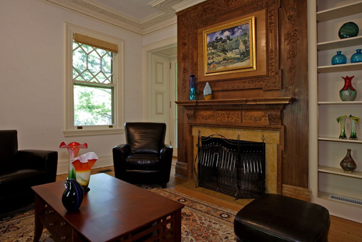 家庭室/图书馆有三扇大窗户、一个巨大的手工雕刻的壁炉 ,及古董意大利大理石饰边、美丽而错综复杂的凹凸天花板造型和一个小酒吧。家庭房通过两扇高大的落地双开法国门,连接到暖房。