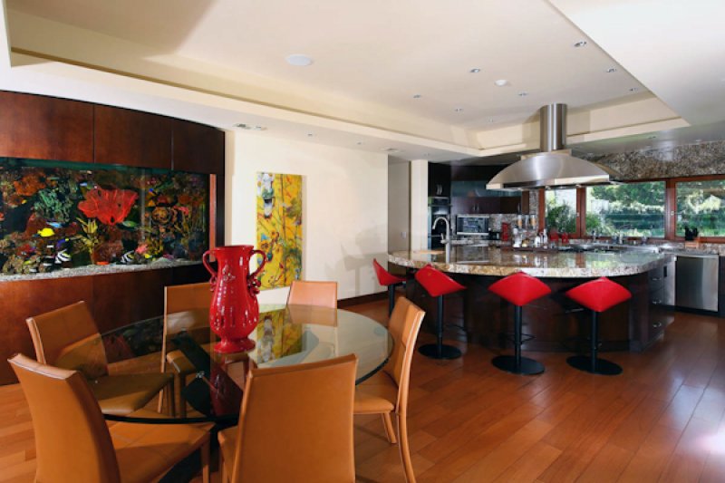 备料充足的美食家厨房拥有一流的设备和设计。对于大厨来说,有米尔(Miele)双烤箱,一个沃尔夫(Wolf)六个火眼的炉子,配带煎饼用的浅锅,加上米尔电炉和米尔蒸锅。商业用的不锈钢罩不但有顶级功能,同时也为这片空间增添了极为漂亮的建筑元素。大型双槽不锈钢洗涤槽,附有碱性水过滤器,宽敞的烹饪台,另带有蔬菜准备洗涤槽,为烹饪大小餐宴提供很多空间。双槽博世(Bosh)洗碗机,两台蒙诺柜(Monogram)双门对开冰箱/冷冻库,提供顶级清洗和实物储存设施。非洲文吉木 (African Wenge) 橱柜,有六吋牛鼻式转角的花岗石厨房工作台面,相互衬托,更加美丽。