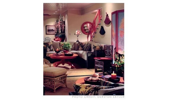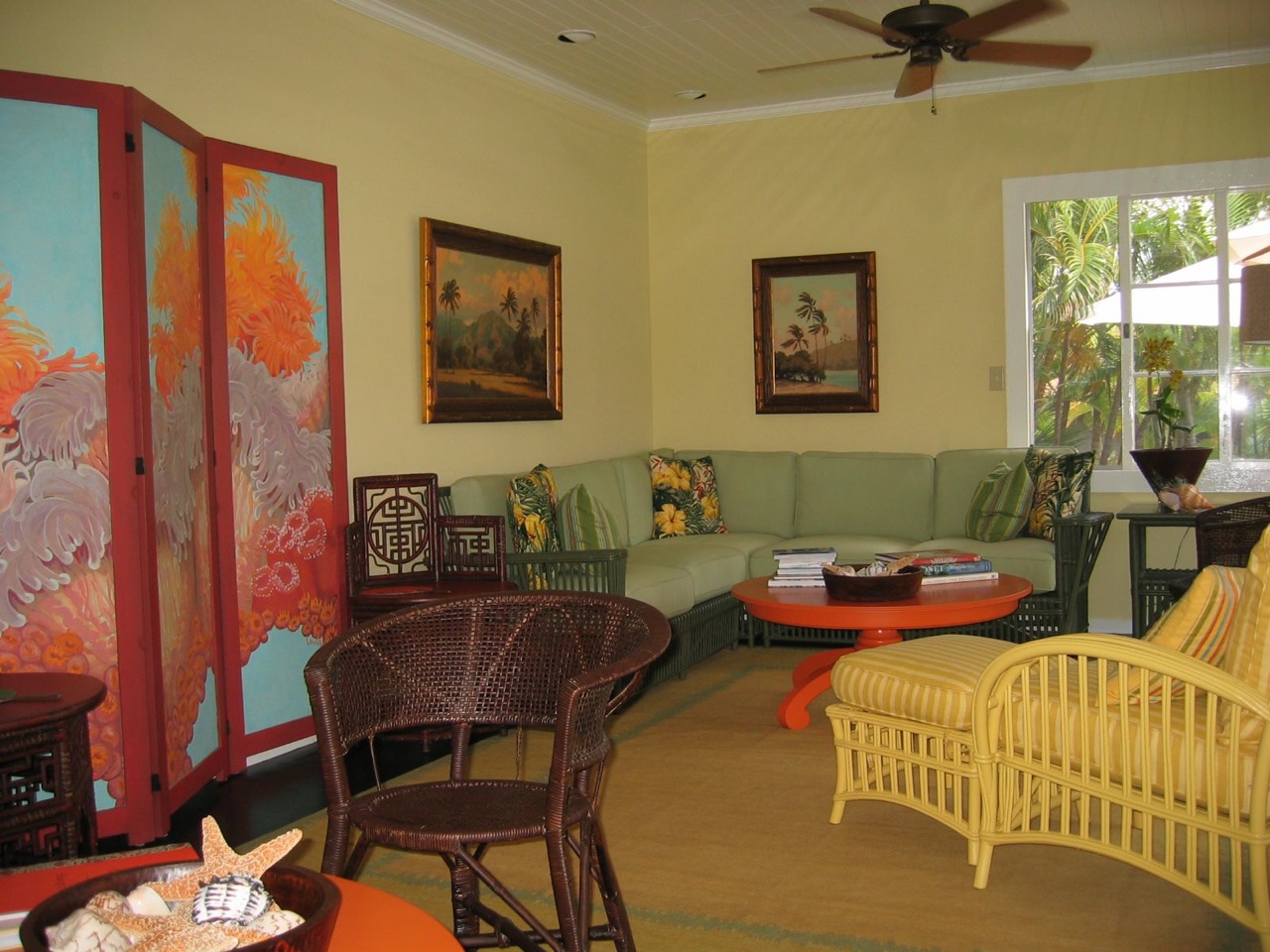 Coffee bean stained floors contrast with ‘Hibiscus’ walls and high gloss white enamel ceilings.  Sculptures by local artist Irving Jenkins and a painted screen of sea anemones line the walls, while painted wicker furnishings by Maine Cottage fill the space that opens up to the lanai overlooking the pool. The reflection of the garden is emulated by the color palette of the decor.