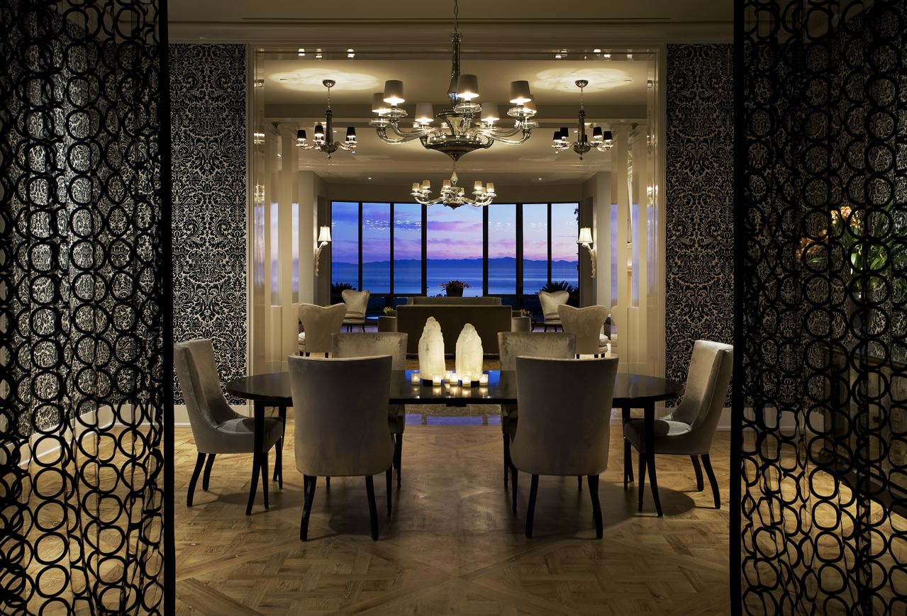 餐厅的钢铁和玻璃门通往一个可娱乐宾客的青石庭院。院子里有一个瀑布喷泉,还有一个横跨整个喷泉的火炉。框在一幅美丽的山海美景中的,是郁郁葱葱的花园。