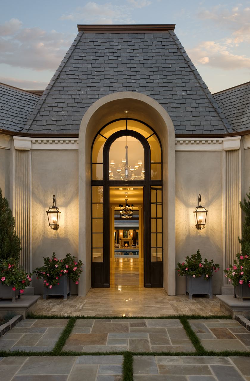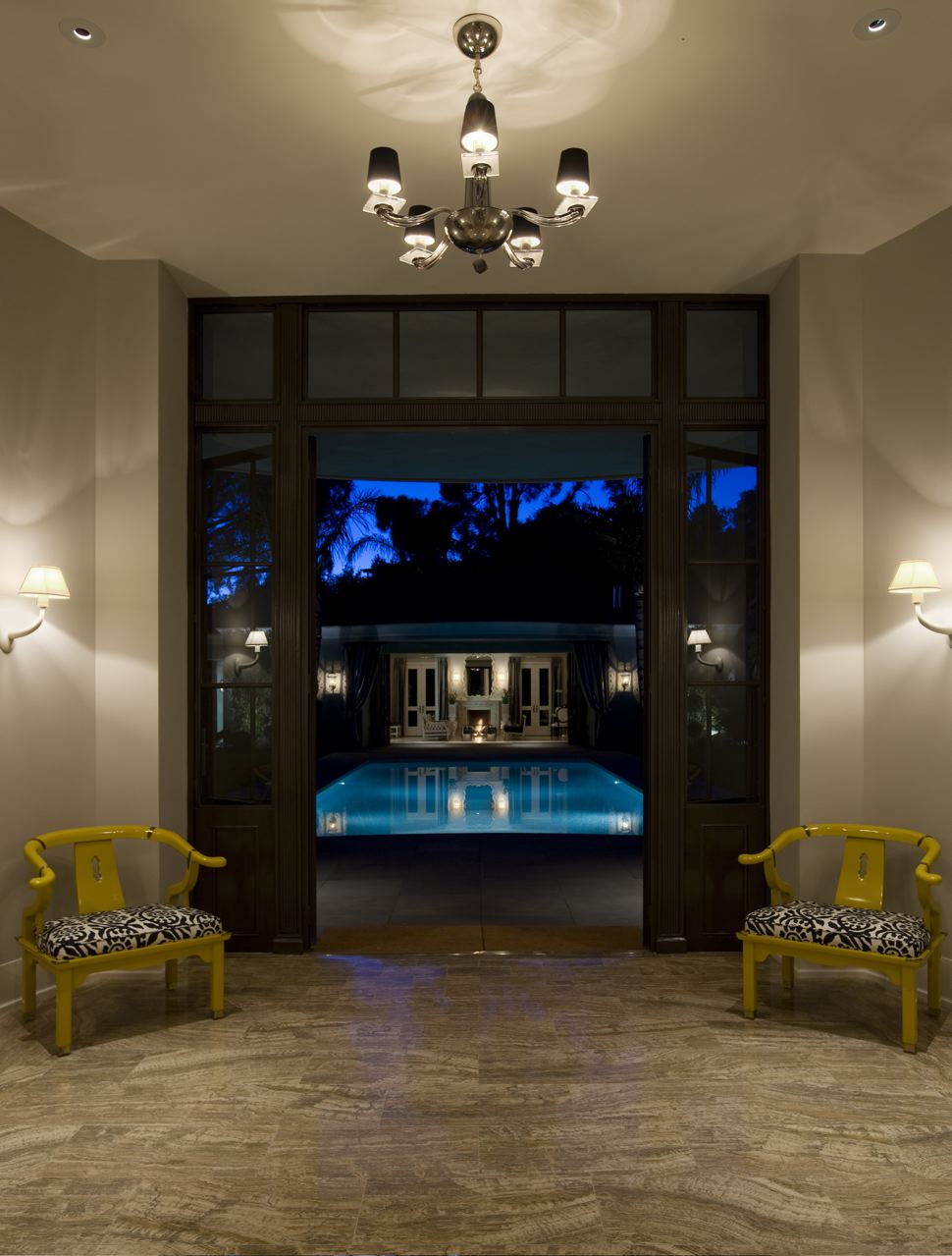 The Entry door assembly is made of Steel and Glass and is very dramatic as it’s soaring height reveals the Murano Glass Chandelier in the Entry Foyer. Looking Beyond the Foyer across the Gallery and across the pool you will see the glowing fireplace in the Pool House.