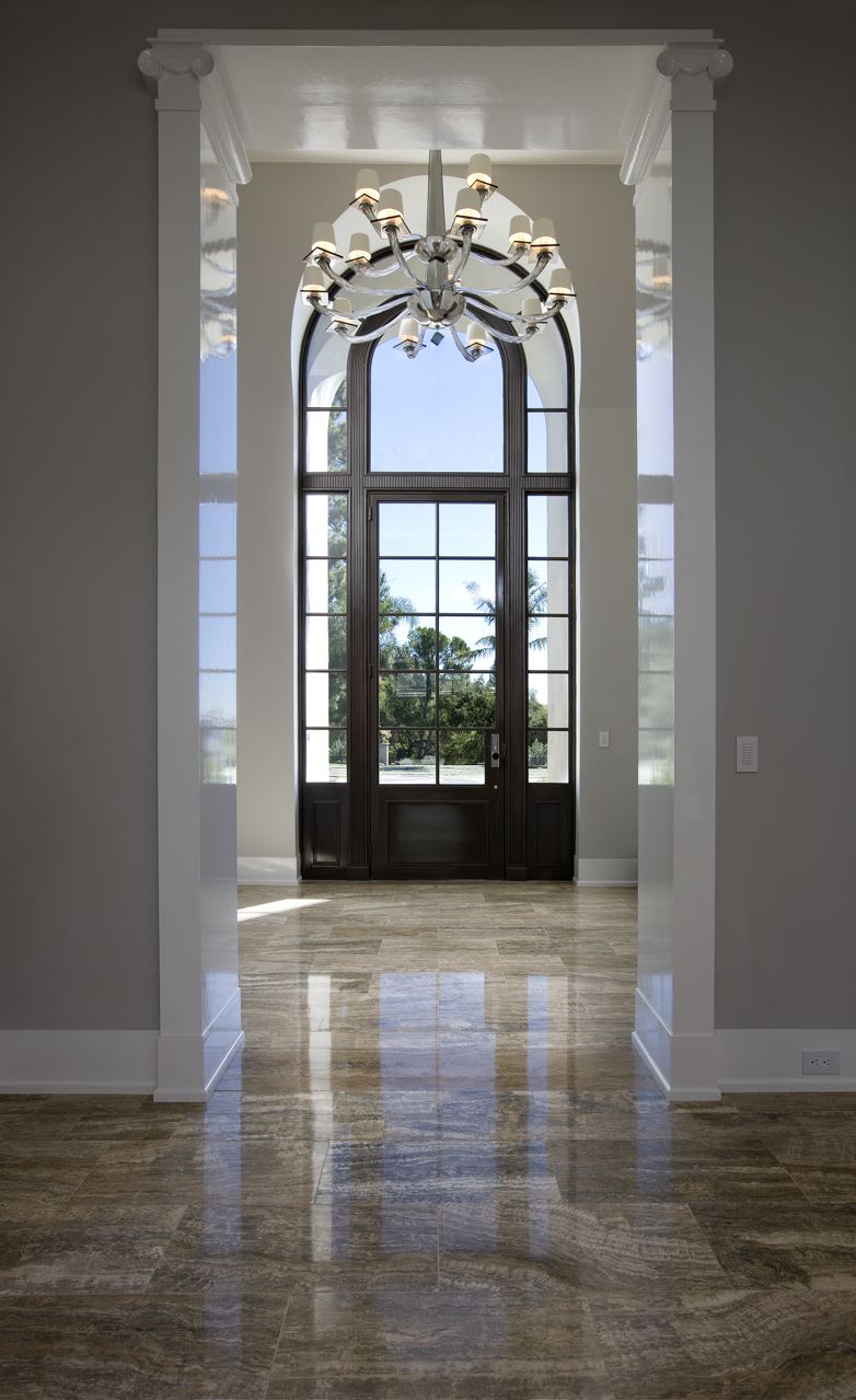 The Main Gallery is very dramatic looking back at the Entry. This Gallery is flanked by two additional Hall Galleries. There is Neo-Classical detailing and Italian Silver Travertine Stone flooring.
