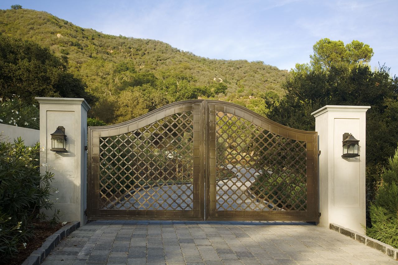 Large Steel Gates grace the entrance to the property. As the gates open, the Santa Ynez Mountains of the Los Padres National Forest are revealed beyond olive grove.