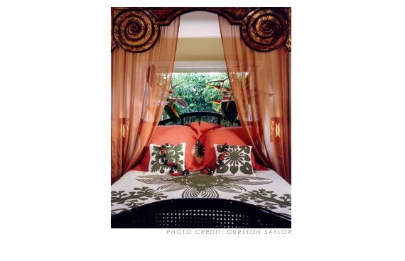 主卧室的海景画面,被纯铜色窗帘框起,而窗帘则随着温暖的热带贸易风滚滚翻腾。黑色的甘蔗床在传统夏威夷拼花被的衬托下,形成美丽的对比。