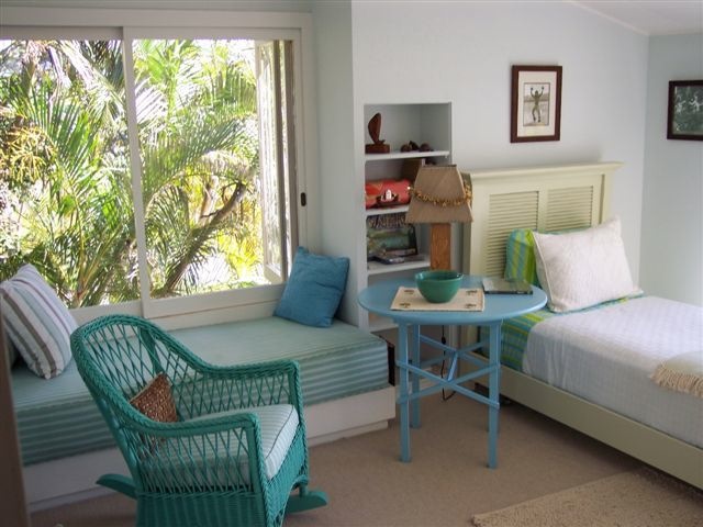 The Honolulu Blue Guest Room is a cozy cool escape from the summer sun. Two sets of vintage accordion doors open to lush tropical gardens while the interior pallet emulates the colors of the tropical sea and sky. The bed is dressed in traditional Hawaiian quilts beneath a painting by Daryl Millard. Painted wicker side tables by Maine Cottage and paddle lamps add to the local vernacular. Separate Bath with shower.