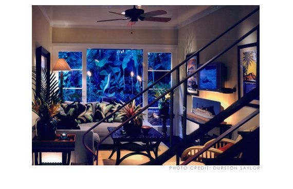 A cozy place to put your feet up in the sun-shaded family room that spills out to the back garden of bright heliconias contrasting with black taro and adorned with sculpture by local artist.