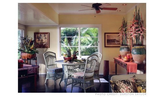 Enjoy breakfast around the painted wicker table by Maine cottage looking out over banyan and banana trees and lush tropical landscape. Enjoy a cool afternoon drink and a game of poker in rattan barrel chairs at the antique Art Deco Burmese Majon table.