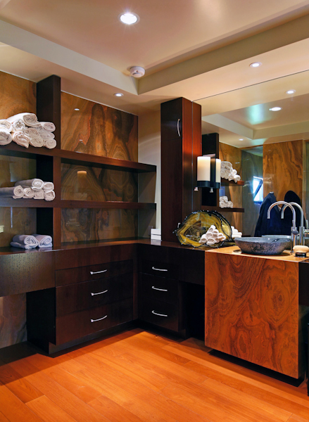The sumptuous master bedroom suite is a true luxury retreat. With a full sitting area including the gorgeous onyx fireplace and incredibly high ceilings highlighted by custom lit coved section, the details in design and execution come together in grand effect. Teak doors, moldings, and shelving harmonize with the teak flooring creating an inviting atmosphere. Three walk-in closets outfitted with custom organizational systems ensure there will be no fighting for closet space.